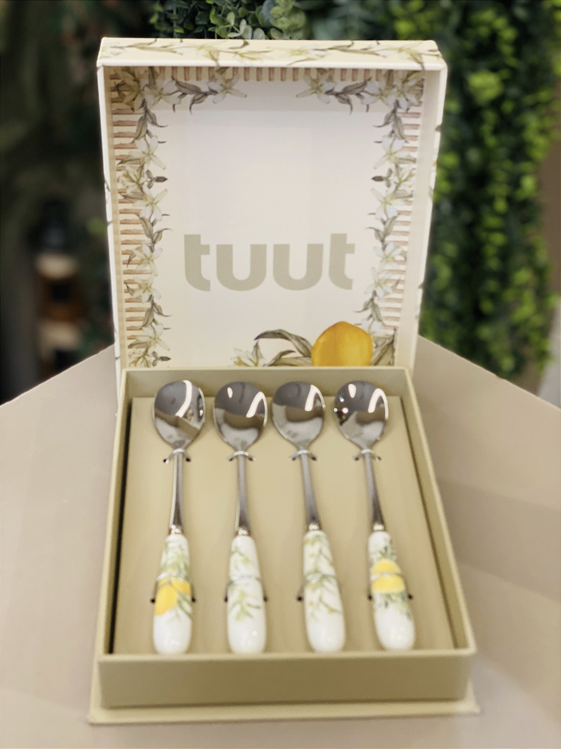 Estojo c/ 04 colheres para sobremesa Coleção Limone 15,5 cm Inox c/ cabo porcelana com estampa de limão